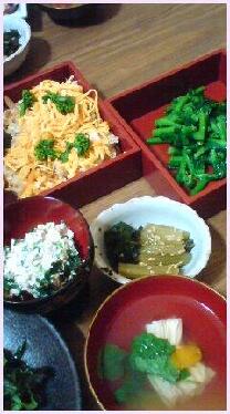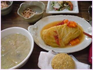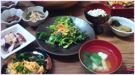 野菜を熱処理した料理、海藻がいっぱいのスープ、少しの魚、豆腐、湯葉、おか